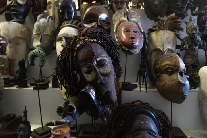 许鸿飞在一木雕店里买了很多老的非洲木雕。