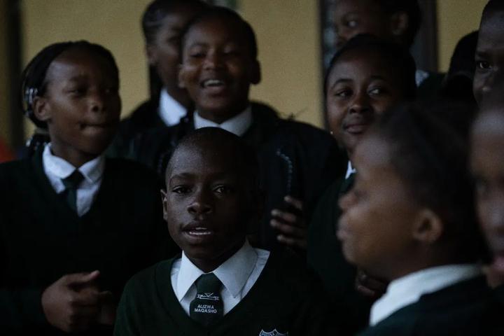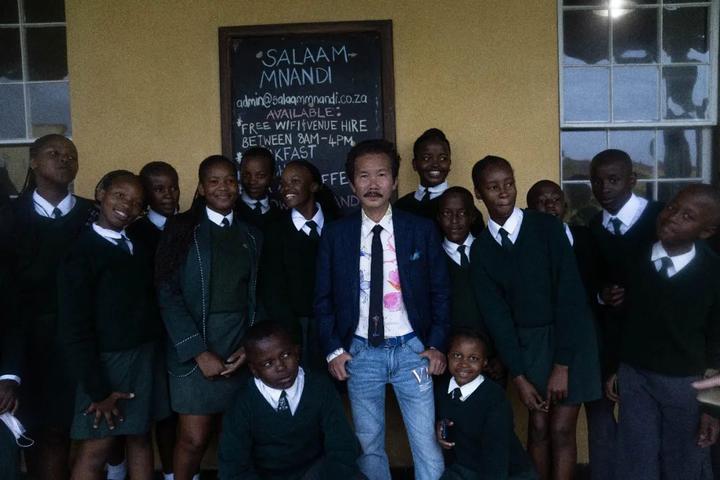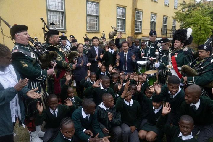 非洲打击乐队,当地土著人也盛妆到来。还有穿着校报的孩子们。