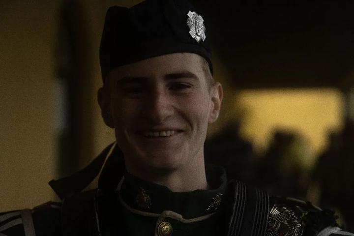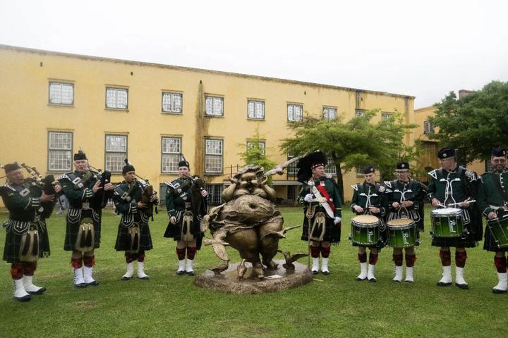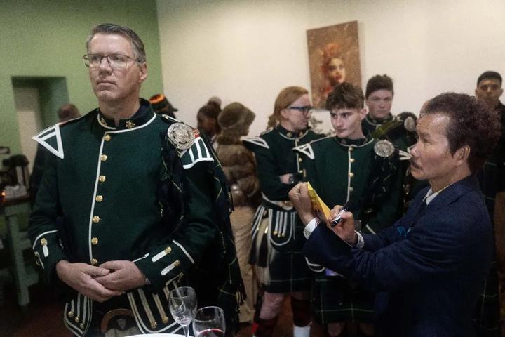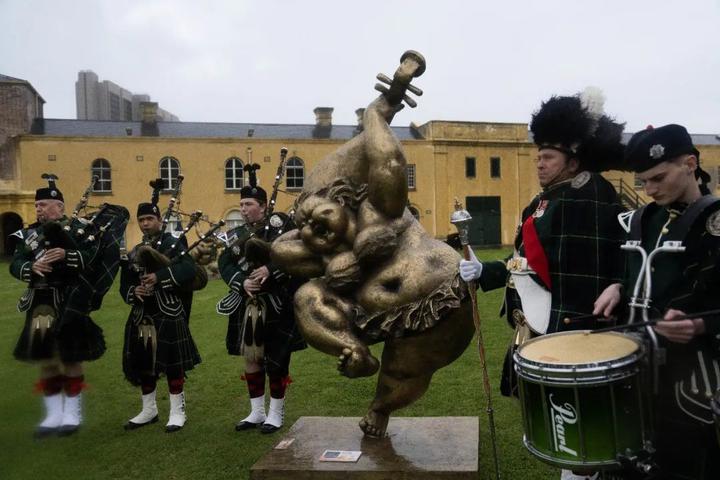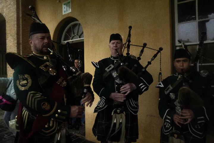 穿着格子裙的苏格兰风笛乐队也出现了。他们背上肩上的乐器是今天开幕典礼的一部分,擦得锃亮。