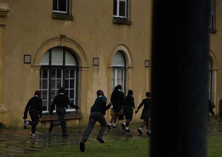 因为中午风雨很猛。大人和小孩们都在长廊上等待。