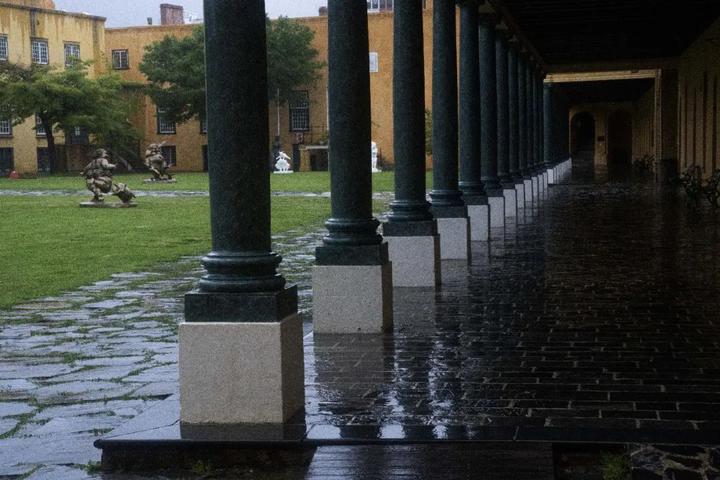 狂风骤雨在大广场里呼啸。光线幽暗,更加显得阴气森森。透露着神秘的气质。