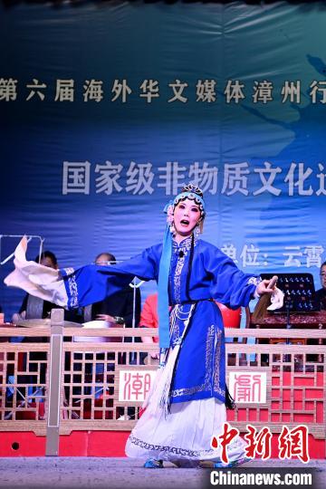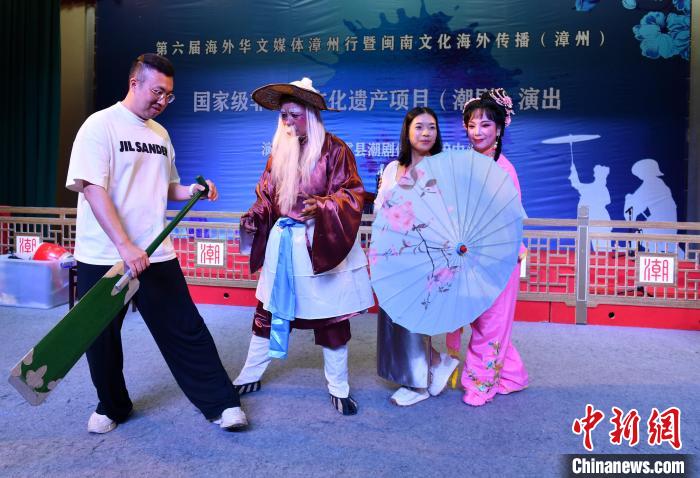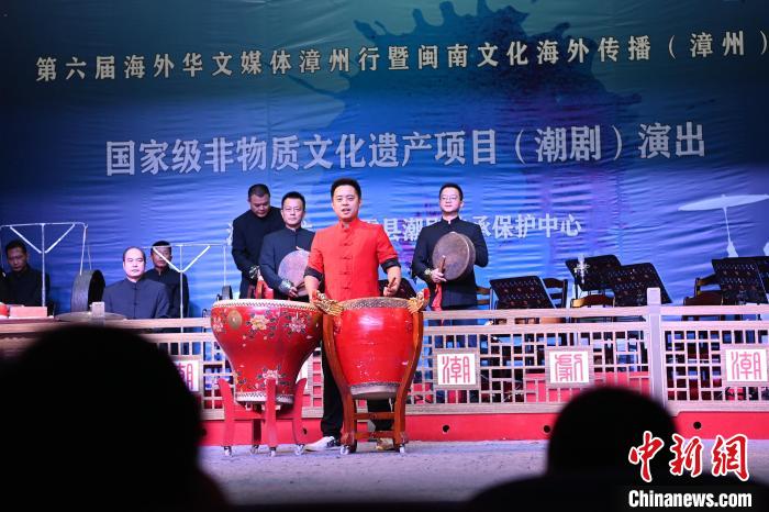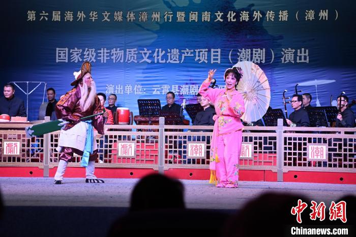 11月4日晚,参与“行走中国·第六届海外华文媒体漳州行”的25家海外华文媒体代表,参访位于福建漳州云霄县潮剧传承保护中心,并观看、体验潮剧表演。潮剧,又名潮州戏、潮音戏,闽南语系剧种之一,是用潮州方言演唱的一个古老的地方戏曲剧种,距今已有450多年历史,流传于闽南粤东及东南亚国家地区华人集聚区,国家级非物质文化遗产。潮剧是宋元南戏的一个分支,吸收了弋阳、昆曲、皮黄、梆子戏的特长,结合本地民间艺术,最终形成自己独特的艺术形式和风格。
