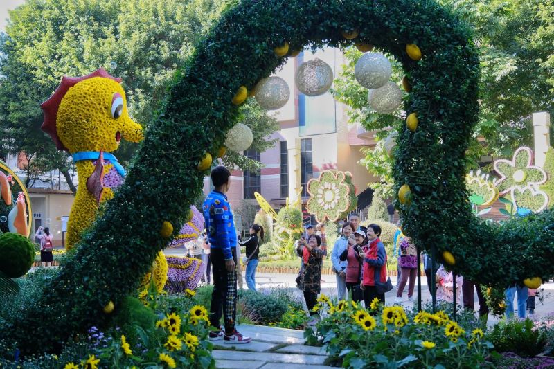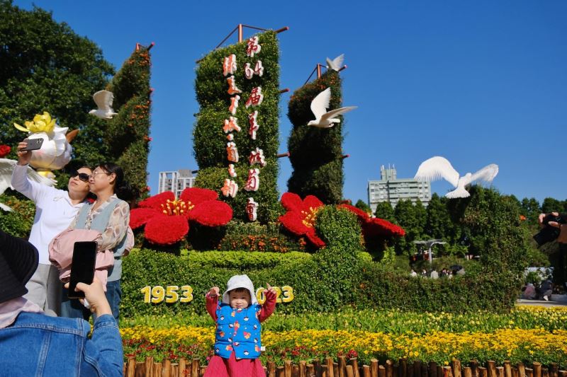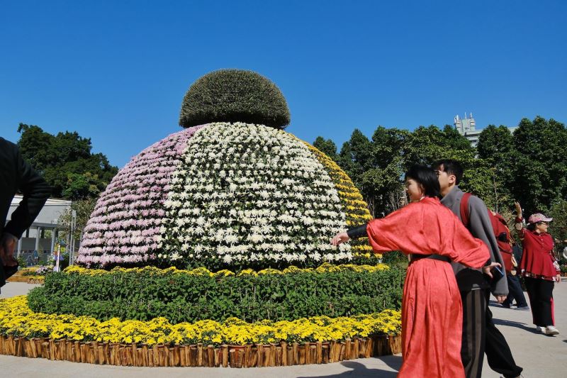 On November18,the64th Chrysanthemum Exhibition was launched in Guangzhou Cultural Park.It is the largest,oldest,and longest professional chrysanthemum exhibition in Guangzhou.This year's exhibition has many highlights:one is"big",the"Double Colored Chrysanthemum"is the largest in this exhibition,consisting of nearly6,000flowers. The second one is"high",the first time to display tall varieties of chrysanthemums,up to2meters. And the third one is"large",the scale of the current exhibition is the largest in recent years.