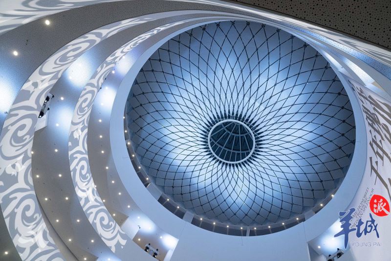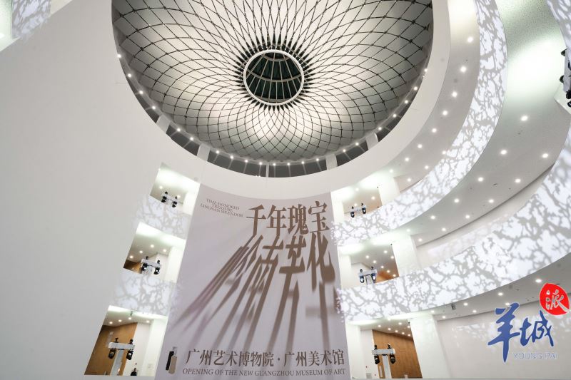 Lingnan: Beauty Beyond Borders| In the Lingnan Art Collection, an era of prosperity blooms. On the evening of Nov 29, the opening ceremony was held at the new building of the Guangzhou Museum of Art. Soaring five floors above ground, the building features a central courtyard measuring 45.4 meters, with daylight streaming in from the dome, creating a natural cave ambiance. Designed around the theme of "red cotton tree flowers blooming in water", the architectural marvel comes to life at night.