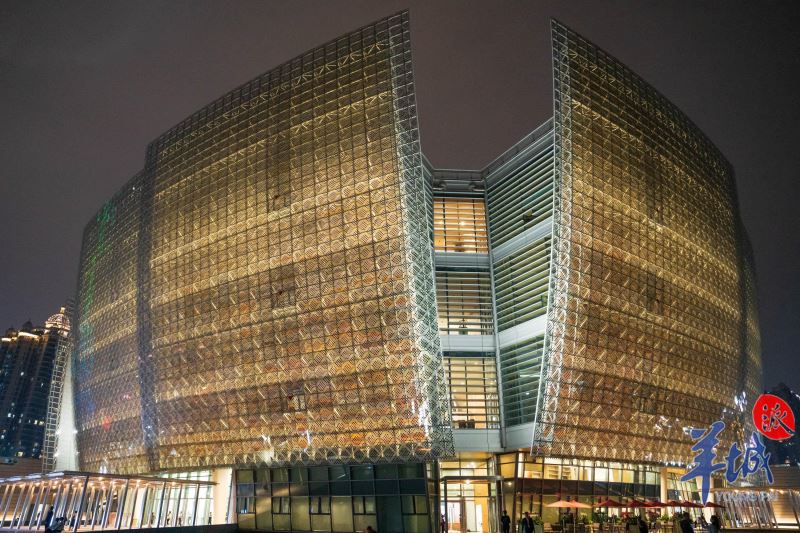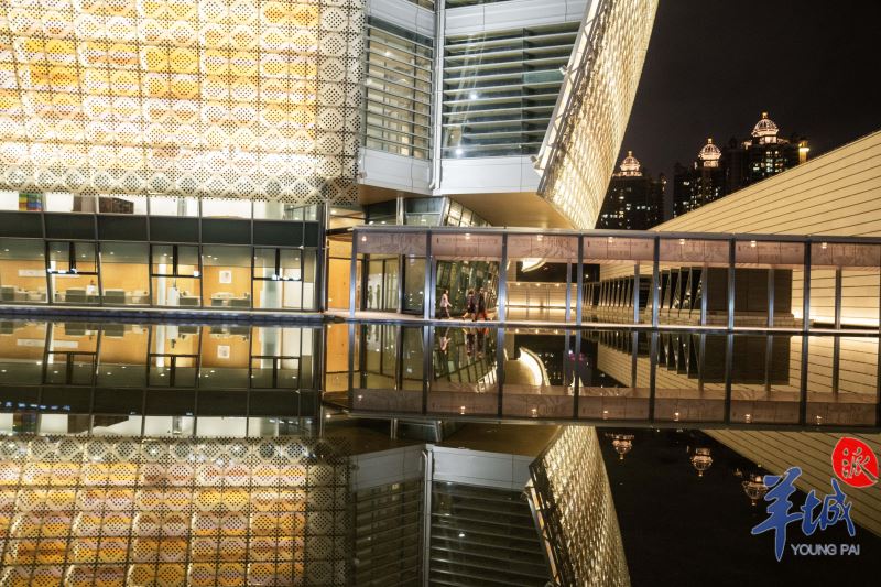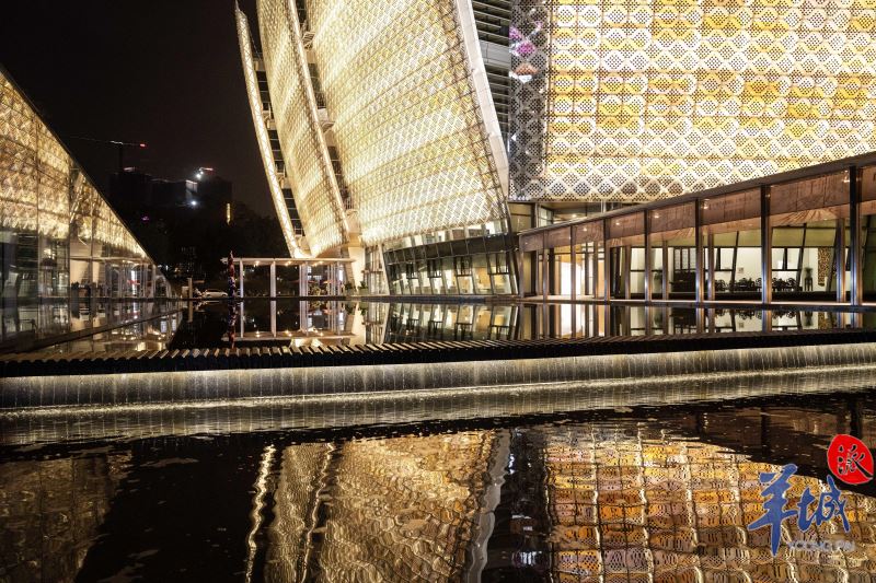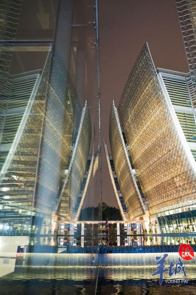 À noite, a parede cortina ilumina-se, adornada com 21.008 peças de vidro fotovoltaico em forma de escama de peixe e painéis de alumínio coloridos, emitindo um brilho radiante. As esplêndidas "pétalas" emitem um brilho encantador, acrescentando um toque de poesia e sonho à linha do horizonte, em harmonia com a Torre de Cantão adjacente. O vidro do edifício principal irradia luz à noite, assemelhando-se a flores coloridas. #SplendidLingnan