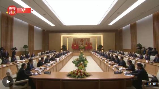 当前,中越关系持续向好发展。昨天,我同阮富仲总书记一道见证双方签署的合作文件,涵盖了两党两国合作的方方面面,充分说明中越关系的广度和深度非同一般。我同阮富仲总书记一道宣布构建具有战略意义的中越命运共同体,开启了新时代中越关系新篇章,相信将为两国人民带来更大福祉,为地区和世界和平、稳定、发展作出积极贡献。