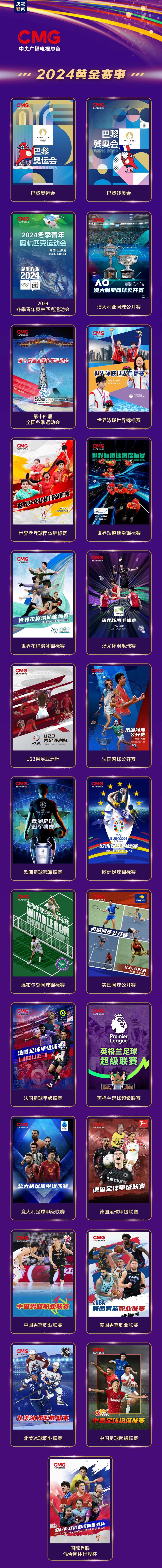 中央广播电视总台还发布了2024年黄金赛事资源:2024冬季青年奥林匹克运动会、澳大利亚网球公开赛、第十四届全国冬季运动会、世界泳联世界锦标赛、世界乒乓球团体锦标赛、世界短道速滑锦标赛、世界花样滑冰锦标赛、汤尤杯羽毛球赛、U23男足亚洲杯、法国网球公开赛、欧洲足球冠军联赛、欧洲足球锦标赛、温布尔登网球锦标赛、美国网球公开赛、法国足球甲级联赛、英格兰足球超级联赛、意大利足球甲级联赛、德国足球甲级联赛、中国男篮职业联赛、美国男篮职业联赛、北美冰球职业联赛、中国足球超级联赛、国际乒联混合团体世界杯。