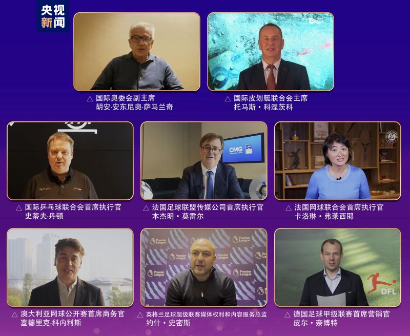 国际奥委会副主席胡安·安东尼奥·萨马兰奇,国际皮划艇联合会主席托马斯·科涅茨科,国际乒乓球联合会首席执行官史蒂夫·丹顿以及法国职业足球联盟、法国网球联合会、澳大利亚网球公开赛、英格兰足球超级联赛、德国足球甲级联赛等国际体育组织相关负责人以视频方式表示祝贺,并期待与中央广播电视总台建立更加紧密的合作关系。
