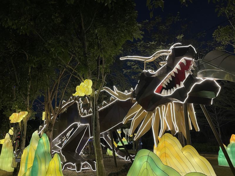 除了上新日場體驗項目,當夜幕降臨時,古鎮及農場都被流光溢彩的燈光喚醒,夜場的主題彩燈裝置再升級,圍繞客韻新年,將小涼帽農場的自然田園風光與奇幻酷炫的光影藝術相結合,打造甘坑奇幻夜2.0版本——「龍游界涇煙火甘坑」主題燈展,新增下雪機及激光秀,以絢爛又浪漫的彩燈光影,描繪出田園野趣版的撩人景色,開啟奇幻浪漫的遊園之夜。