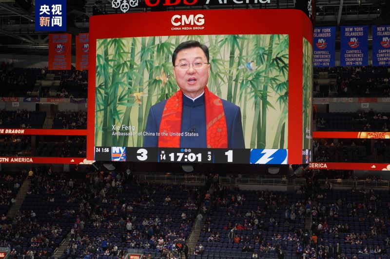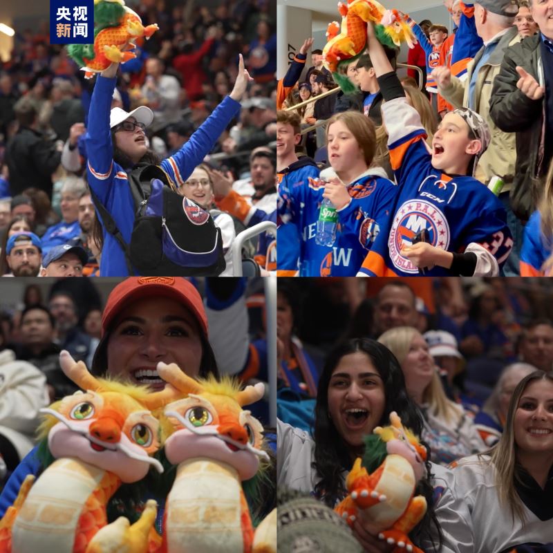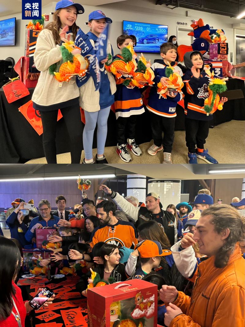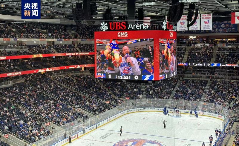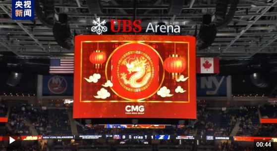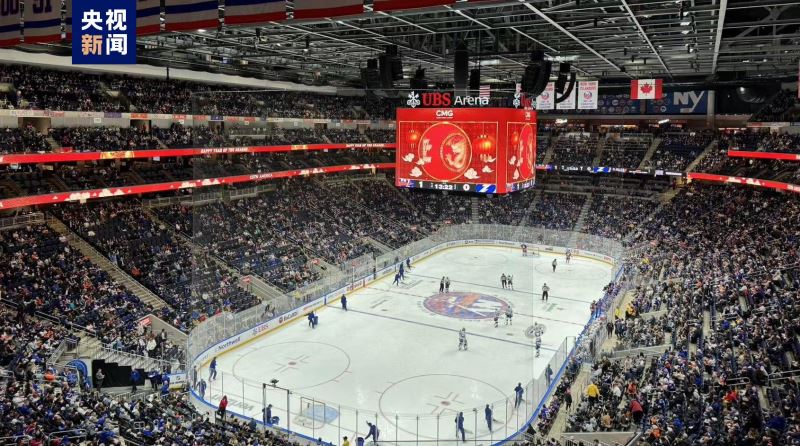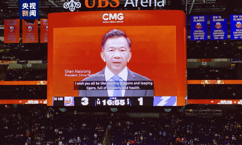 当地时间2月8日,在中国农历除夕之际,中央广播电视总台在美国纽约北美职业冰球联赛现场举行了总台春晚文化推介活动,一万多名美国观众在中国红烘托的热烈气氛中,感受中国春节的文化魅力,共同迎接龙年新春的到来。