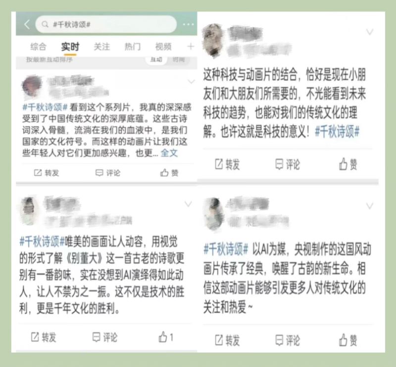 节目探索诗画融通的国风动画片新呈现,让广大青少年进一步加深了对中国经典诗词的理解和喜爱。“AI”“总台”“千秋诗颂”等成为网友热议高频词。截至2月27日20:00,话题#千秋诗颂#阅读量超791万次。网友纷纷留言:“看到这个系列片,我真的深深感受到了中国传统文化的深厚底蕴。这些古诗词深入骨髓,流淌在我们的血液中,是我们国家的文化符号”“以AI为媒,央视制作的这部国风动画片传承了经典,唤醒了古韵的新生命”“唯美的画面让人动容,用视觉的形式了解《别董大》这一首古老的诗歌更别有一番韵味”“这种科技与动画片的结合,恰好是现在小朋友们和大朋友们所需要的”。