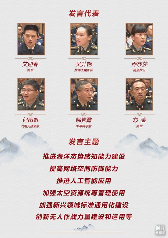 3月7日下午,在解放军和武警部队代表团全体会议上,共有6位代表发言。其中2位来自战略支援部队,其余4位分别来自海军、南部战区、军事科学院、陆军。