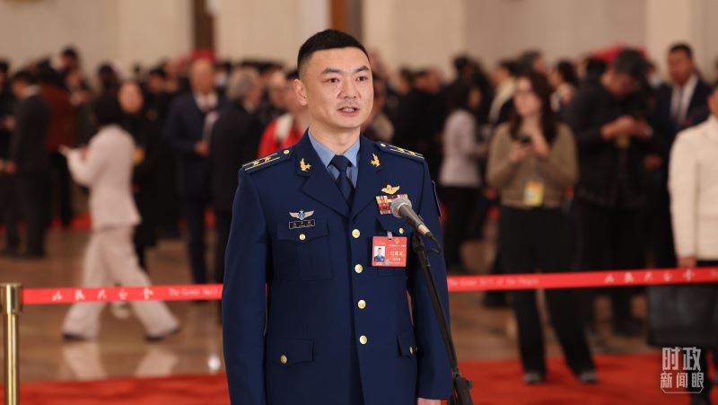△2024年3月5日,十四届全国人大二次会议首场“代表通道”集中采访活动中,全国人大代表、空军航空兵某旅副参谋长高中强正在答记者问。(图/视觉中国)