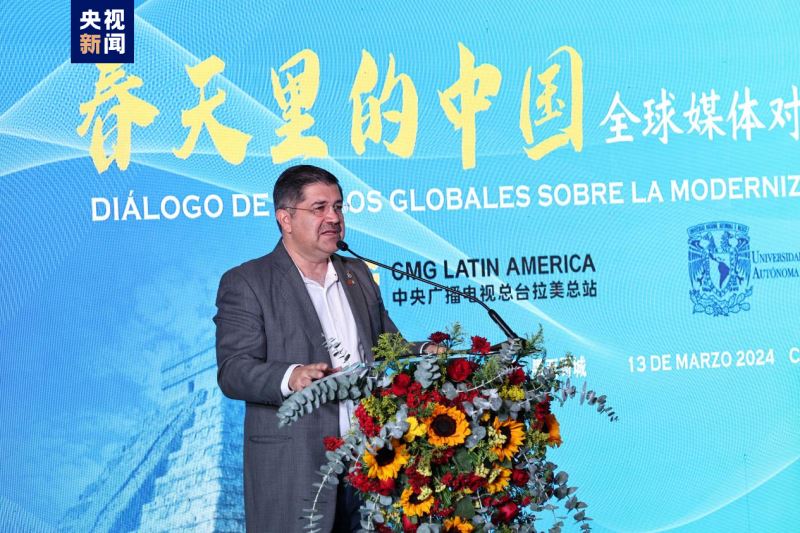 当地时间3月13日,由中国中央广播电视总台与墨西哥国立自治大学共同主办的“春天里的中国”全球媒体对话会墨西哥专场在墨西哥城举行。中国驻墨西哥大使张润,墨西哥众议院墨中议会友好小组主席波列文斯基、副主席阿科斯塔,墨西哥国立自治大学中国研究中心主任杜塞尔等中墨两国政商学界及媒体代表逾百名嘉宾出席活动。