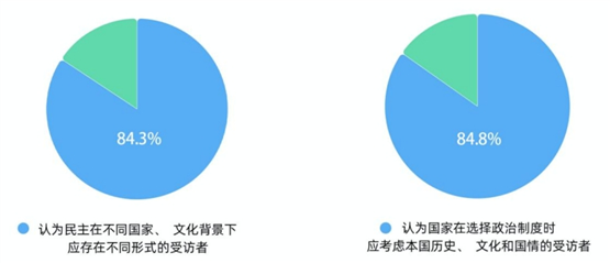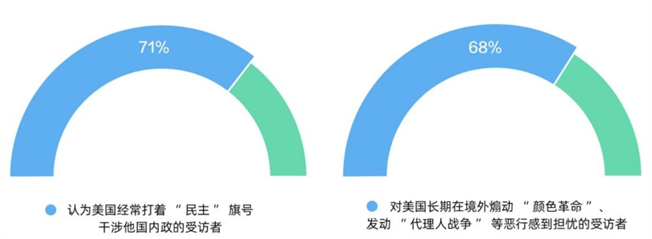 调查中,84.3%的全球受访者认为,民主在不同国家、文化背景下应存在不同的形式,不存在高人一等的民主模式和放之四海皆准的政治制度;84.8%的受访者认为,一个国家在选择政治制度时,应当考虑本国的历史、文化和国情;80.3%的受访者认为世界上存在多种文明对世界发展具有积极的作用;79.5%的受访者对于美国打着“民主”旗号在全球范围内谋求霸权的行为表示强烈反对;86.8%的受访者呼吁美国在与其他国家进行国际交往的过程中,应本着相互尊重、求同存异的理念,尽快停止其霸权行径。