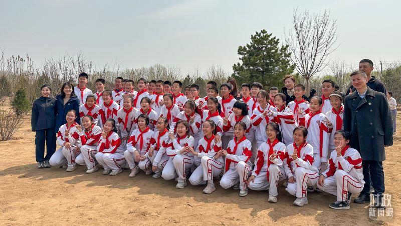 △参加植树的少先队员们合影留念。(总台央视记者卢心雨拍摄)