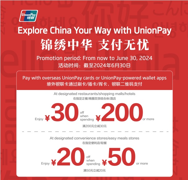 云闪付app推出“商圈支付优惠”“锦绣中华支付无忧”专属优惠,刷卡可享立减,使用境外发行的62开头银联卡刷卡或挥卡乘坐公交地铁还可享受5折优惠。