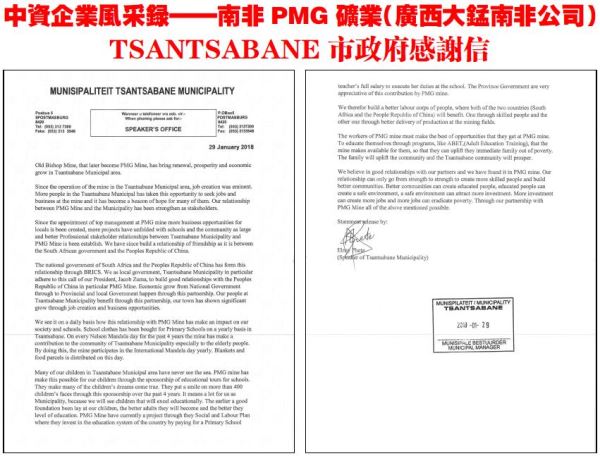 Tsantsabane市镇府致南非PMG矿业(广西大锰南非公司)感谢信