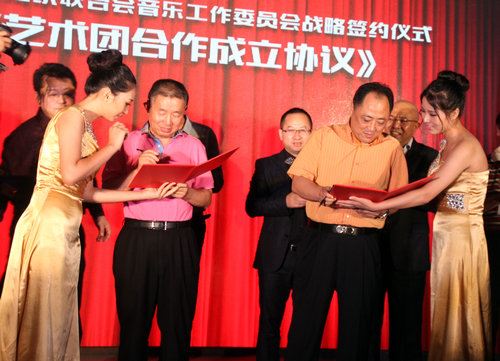 现场签约仪式 本次音乐工作委员会成立二周年庆典由二炮文工团著名歌唱家、中国广播电影电视社会组织联合会音乐工作委员会理事长金波和马瑛瑛主持;由中国音乐家协会第八届副主席、中国广播电影电视社会组织联合会音乐工作委员会会长张千一为二周年活动庆典做主题发言;音乐工作委员会常务副会长兼秘书长程矛做工作报告;中国广播电影电视社会组织联合会音乐工作委员会名誉会长、国家一级作曲家王立平代表《中国影视优秀艺术奖》全体专家评委致辞;著名剧作家、词作家、中国剧协副主席阎肃代表顾问团致辞。