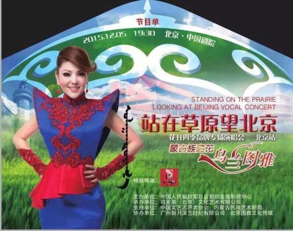 乌兰图雅巡回个唱北京站12.5草原live show震撼开启,再度引发世界华人关注。 星光璀璨,12月5日晚,北京中国.剧院“蒙古族之花”乌兰图雅“站在草原望北京”北京站演唱会震撼开启。本次演唱会是由中国人民解放军总后勤部金盾影视中心,司麦澳(北京)文化艺术有限公司、中国文艺志愿者协会、内蒙古民族艺术剧院、联合推出的一道视觉听觉的多重文化盛宴。 本次晚会中央电视台著名节目主持孙小梅蒙古族著名主持人敖特根毕力格担当主持 当晚,嘉宾“蒙古歌王”齐峰、“蒙古舞仙”李德戈景的民族歌舞、“八骏马头琴乐团”的蒙古族原生态艺术呼麦、马头琴、长调、传统跟现代音乐完美结合,一起引爆现场观众热情;国际钢琴家汪洋将指尖上的舞蹈艺术精彩展现,让现场所有人为之狂热。“广场舞王子”王广成带领观众现场教学唱跳《站在草原望北京》广场舞,展健康生活、充满青春活力。同时内蒙古民族艺术剧院对乌兰图雅北京演唱会高度重视,派出了强大的舞蹈阵容,他们的演绎使演唱会充分体现出内蒙古唯美音画式的晚会特点。此次,乌兰图雅演唱会再次打造最美最靓丽的草原名片。 在长达二个月的强势宣传中,乌兰图雅北京站演唱会同时还获得了央视著名主持人朱军、水均益、中央电视台新闻主播纳森、中国曲艺家协会主席、中国文联文艺志愿者协会主席姜昆、重量级艺术家阎维文、蒋大为、白雪、蔡国庆,一代草原歌唱家德德玛、著名男中音歌唱家杨洪基、著名草原歌唱家乌日娜、布仁巴雅尔、内地著名演员周恩来扮演者刘劲、内地流行歌王韩磊等前辈好友祝福支持,大量粉丝鼎力支持,数媒体纷纷聚焦中国.剧院草原歌后全国巡演北京站。 “花开四季”品牌专场演唱会乌兰图雅歌声献礼祖国 第二篇章夏之恋-花音愿向观众展示了内蒙古的民族形象,节奏欢快的《火辣辣的情歌》和《送你一首吉祥的歌》,把蒙古民族的热情好客、真诚善良的民族性格传递到每一位观众的心里,一首内蒙古布里亚特民歌《小草》唱出了坚强又积极乐观的草原人用歌声唱着他们的生活的点滴。 第三篇章秋之韵-花.音.缘以经典民歌全新演绎为主,《蓝色的故乡》《诺恩吉娅》《美丽的草原我的家》重新编曲,增加了现代流行元素,老歌新唱,老曲新编的方法呈现完全不同的试听感受,赋予了经典全新的生命力。 第四篇章冬之律-花.音.圆一曲《我的蒙古马》代表着草原儿女坚忍不拔的毅力和执着向上的不懈追求。乌兰图雅把获奖新草原红歌《站在草原望北京》、2015新歌《阿尔山的姑娘》,成名曲《套马杆》作为压轴曲目,将演唱会气氛推向高潮!现场的欢呼声此起彼伏!应观众的强烈要求乌兰图雅又加唱一首《草原上升起不落的太阳》,当那动情的歌声响起,在观众的大合唱中,演唱会完美谢幕! 乌兰图雅北京演唱会舞美再度升级浓郁中华情。 |
