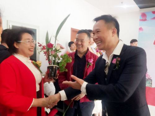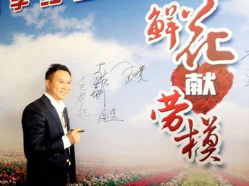 金波在鲜花版签上自己的名字 中华志愿者杂志(记者:许顺喜 摄影:可依)五一前夕,由北京市花卉协会、大兴区月季办联合组织策划的“月季红五月 市花进万家 鲜花献劳模”慰问先进人物为主题的公益活动在京隆重举行。我国著名军旅歌唱家金波应邀出席活动现场,并演唱《踏着花香来》为首都劳模精彩放歌。