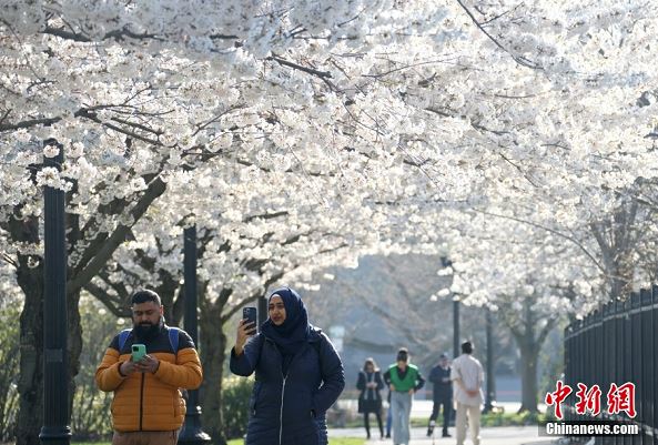 当地时间4月27日,加拿大多伦多的樱花正值盛放期,民众在加拿大展览中心内的樱花树下拍照。