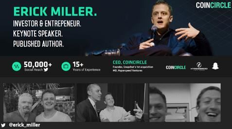 COINCIRCLE的区块链团队人才济济,包括众多来自不同国家的出色工程师和产品市场顾问。作为公司的创始人兼CEO,Erick Miller有着超过15年的创业经历,出版五本书,在智能机器人、高清成像技术等多个领域的国际性论坛发表演讲,和多位著名企业家交流,甚至受到了美国前总统奥巴马的接见。