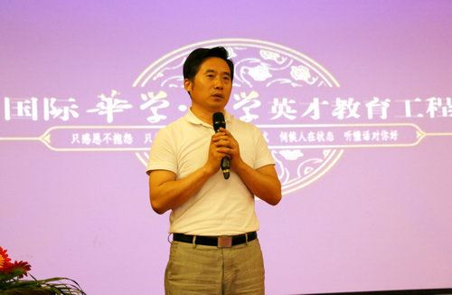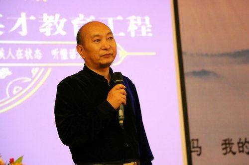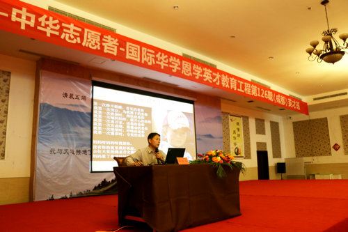 中华志愿者协会国学公益大讲堂主任邓海一发言 活动现场,全体志愿者首先为汶川大地震所有遇难者默哀一分钟,然后,四川省完美春天公益协会会长古米蓝致悼念词;中华志愿者协会国学公益大讲堂主任邓海一、对外联络部主任赵佳运等志愿者代表分别发表了不同讲话。期间,邓海一、赵佳运代表中华志愿者协会向完美春天公益协会、北京华学教育研究中心分别赠送了书画作品。