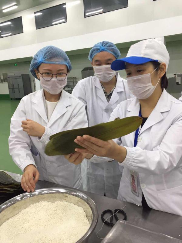 生产车间的工人们正在包粽子