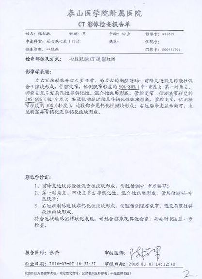 (患者张纪林治疗前心脏造影单,已堵塞百分之一百)
