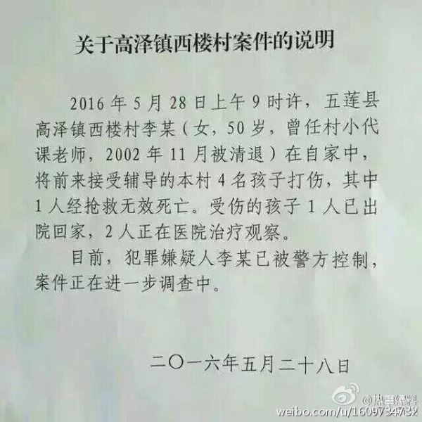记者看到,当地公安部门已经进行了通报,“2016年5月28日上午9时许,五莲县高泽镇西楼村李某(女,50岁,曾任村小学代课老师,2002年11月被清退)在自己家中,将前来接受辅导的4名孩子打伤,其中一人经抢救无效死亡,受伤孩子1人出院回家,2人在医院接受治疗。目前犯罪嫌疑人已经被警方控制。”