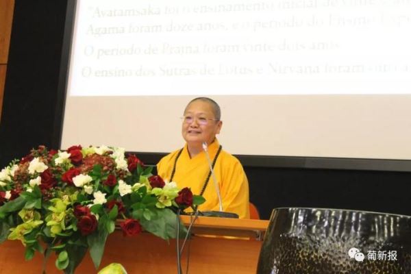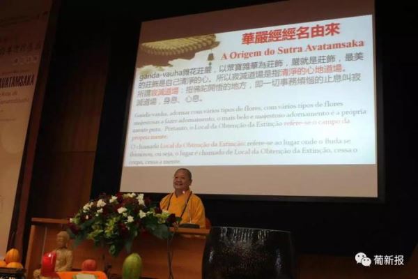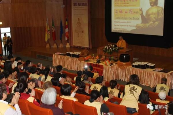 上周日下午3时,葡萄牙佛光山·里斯本佛光协会于里斯本卫生科技高等学校(Escola Superior de Tecnologia da Saúde de Lisboa)大礼堂举办了佛学讲座,邀请到满谦法师为大家讲解佛经——《华严经普贤行愿品》,随后举行了三皈五戒典礼。场外绵绵细雨,却抵挡不住观众的热情,场内座无虚席,不少大人带着孩子们前来聆听大师的讲解;此外,现场还配备葡语同声翻译,吸引不少葡萄牙友人到场听讲、学习。
