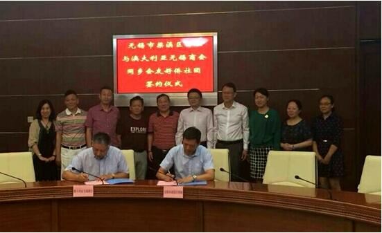 双方还就建立友好侨社团达成协议,金建林主席和张仲达会长分别代表梁溪区侨联和澳大利亚无锡商会签约。秦咏薪区长、市侨联张筠副主席、及区委常委、统战部长朱雄、市侨联经济联络部部长许竹敏等领导和来宾见证了这一历史时刻。
