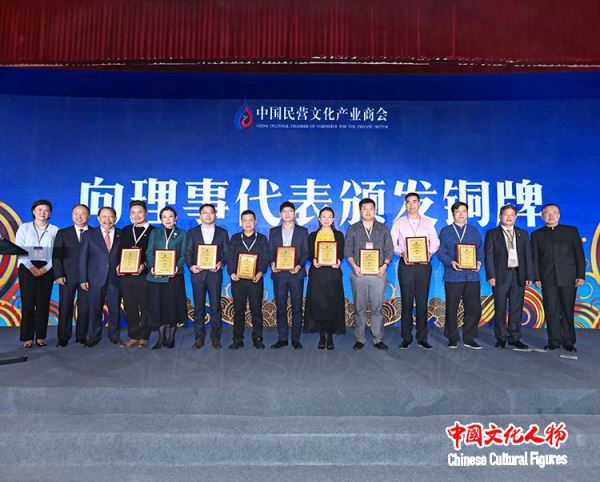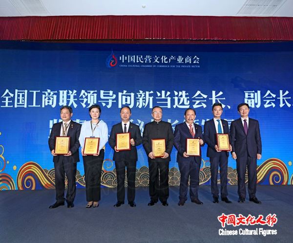 中国民营文化产业商会新任会长吕建中,常务会长吴建荣、陈建国、郑立国、赵丽佳为新当选的常务理事代表授牌并合影