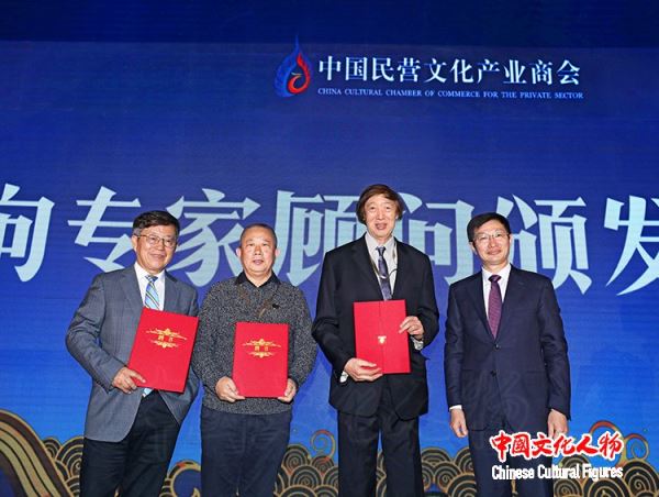 全国工商联党组成员、副主席李兆前为中国文联荣誉委员、著名作家、画家、文化学者冯骥才,中国(海南)改革发展研究院院长迟福林,中国传媒大学文化产业管理学院院长兼文化发展研究院院长范周颁发中国民营文化产业商会专家顾问聘书
