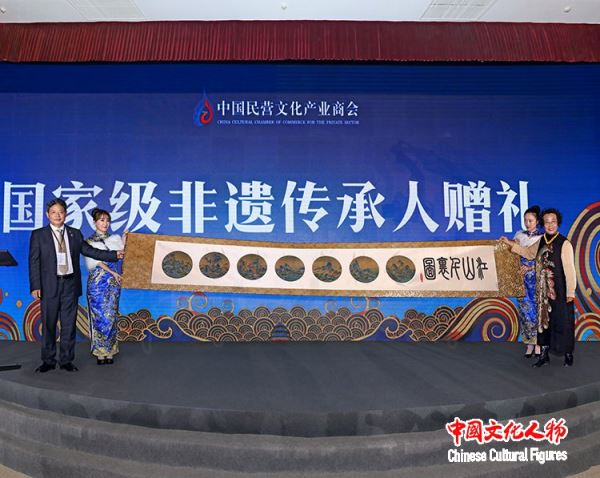 国家级非遗传承人周淑英向中国民营文化产业商会赠送河北蔚州剪纸作品《千里江山图》