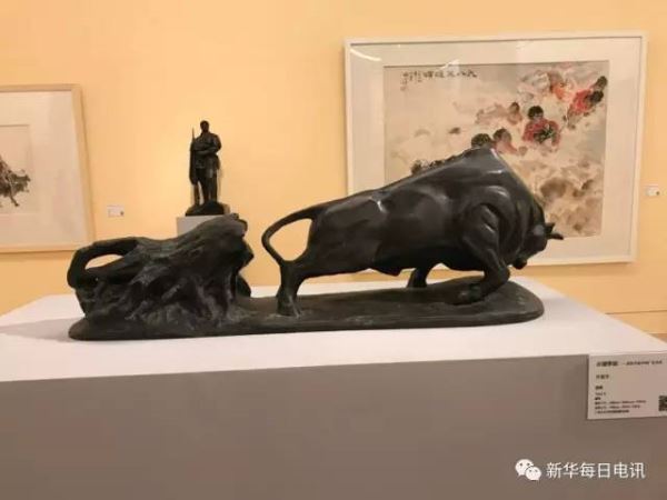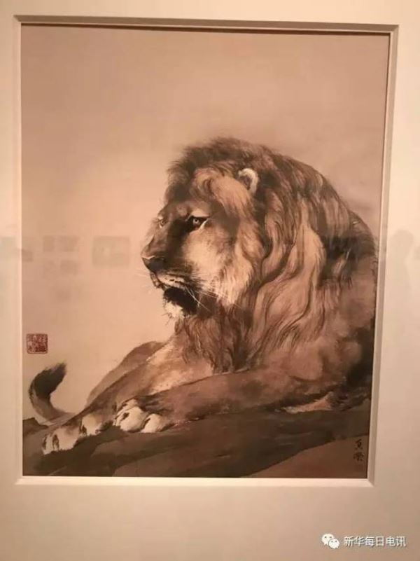 一楼大厅里,一些老年观众在作品《狮》前久久停留。画面中一只雄狮横卧在缓坡上,似乎在梦中受惊而醒,有些恼怒地抬头逼视前方,两只前腿虽然并未抬起,但爪子却已抓入地中,随时可以一跃而起,威猛的气势毕现。这幅作品令人很难相信出自女子之手,它是中国革命元老级人物之一何香凝女士的作品。