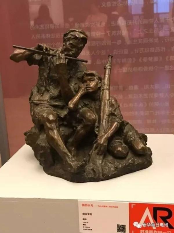 残破的军帽、褴褛的军衣、裸露的脚丫,老战士吹着笛子,满脸稚气的小战士蜷缩在他的身旁,一手抱着长枪,一手托着下颌,伴着笛声憧憬着未来……展厅里,潘鹤的《艰苦岁月》是公众最熟悉的作品之一,同时也是新中国美术最具代表性的雕塑作品之一。“是革命现实主义和革命浪漫主义创作方法相结合的绝佳体现,它既有高度的美学价值,又阐释了党的文艺政策方针上具有的说服力。”许钦松说。