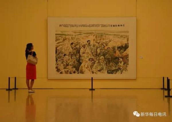 在中国美术馆一楼展厅里,大型历史题材中国画《习仲勋在南梁》被布置在“弄潮擎旗”板块的显要位置,画作描绘了国民党统治时期,在陕甘宁建立第一个苏维埃政府,尝试治国试验的时年32岁的年轻革命家习仲勋“敢为人先”的故事。