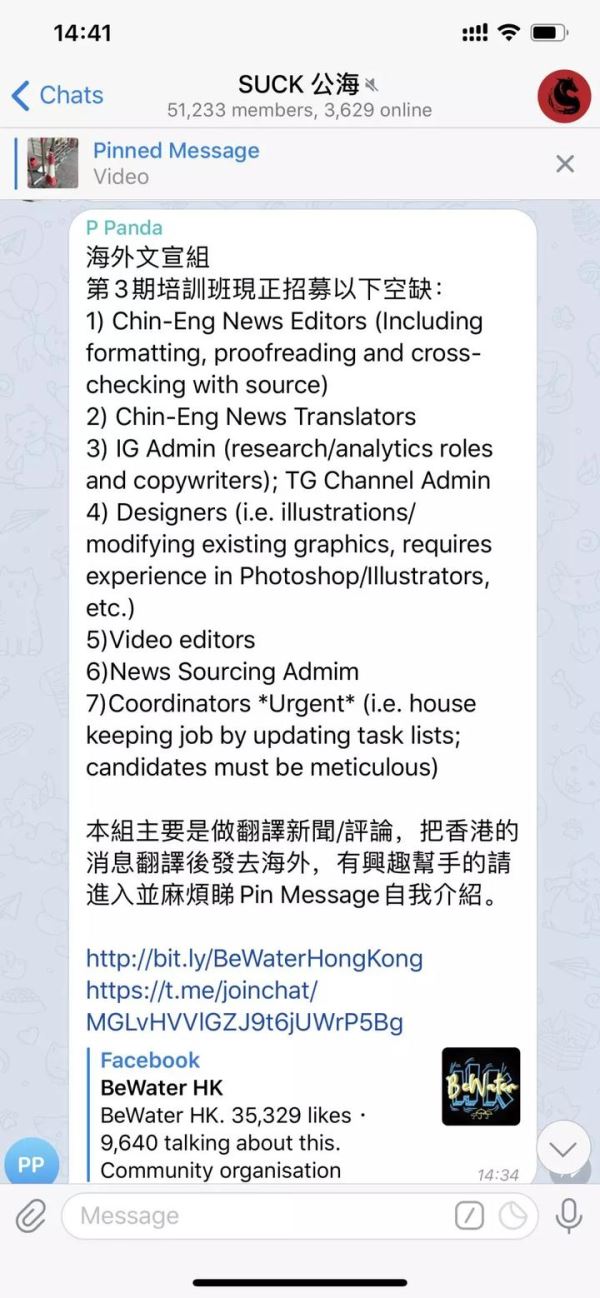 12月5日,我们在文宣频道内看到一则招聘启事,标明为“海外文宣组第三期培训班”,招募岗位包括:中英文新闻编辑、中英文翻译、Instagram和Telegram管理员、图片设计、视频编辑等,并注明其工作主要是将香港的消息翻译后发到海外。