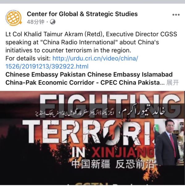 △巴基斯坦全球战略研究中心在脸书账号上发表关于新疆反恐的文章