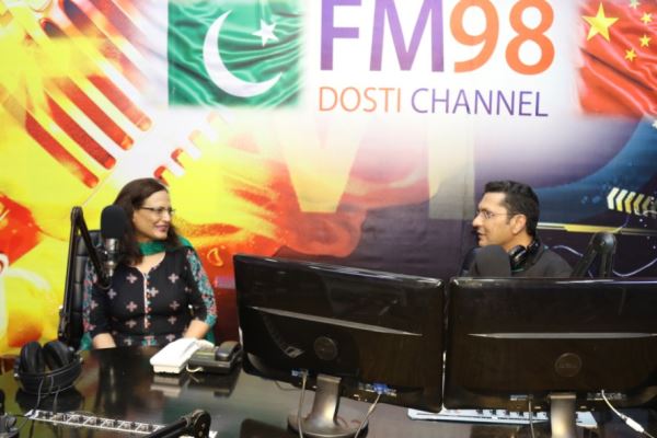 △巴基斯坦高级记者法兹亚·沙希德(女)做客巴国家电台FM98中巴友谊台