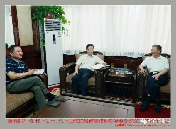 孔根红首先祝贺王宏斌光荣当选党的十九大代表,指出一个基层党员连续六届当选为党代表,这在党的历史上也不多见,是中央对王宏斌个人的肯定,也是对南街事业的肯定。他介绍说:“《t望中国》杂志作为香港的一个媒体,爱党爱国,高度重视南街村的发展经验,这次是我们第三次来采访。”结合此次采访,他说,“我曾看过很多农村,但是像南街村这样的情况在全国独具一格,率先实现了农业产业化、工业化、集团化、规模化、城镇化,最让我们难忘的也是核心的,是集体化、财富的共融化。南街村给我的印象是,构建了一条共同富裕发展之路,没有贫富差别,这个经验非常难得。我想请教王书记,南街村是如何实现共同富裕的?有哪些做法、经验和机会?”王宏斌回答说:“南街村有今天,是党培养的结果,就是南街村的全体党员没有忘记初心,几十年来一直在实践我们共产党人的信仰――共产主义。当然南街村几十年来也走过了坎坎坷坷不平坦的道路,但是每遇到困难时,南街村的群众都站出来给予支持,帮助南街村渡过难关。实践证明,群众是真正的英雄。”他具体阐释了南街村能有今天的五个因素:一是党的政策好;二是南街人的选择;三是各级领导的支持;四是信仰的力量;五是坚持毛泽东思想的结果。王宏斌结合南街村实际提出个人见解:“通过几十年的实践我们认为,中国的‘三农’问题要想从根本上得到解决,脱贫攻坚工作要想彻底圆满画上句号,必须走集体化道路,否则,‘三农’问题解决不好,脱贫攻坚工作只能是水过地皮干。只有建立一支永久的脱贫攻坚工作队,也就是说一个村的党组织,要带领广大群众走集体化道路,脱贫攻坚工作才能彻底圆满画上句号。”