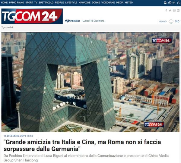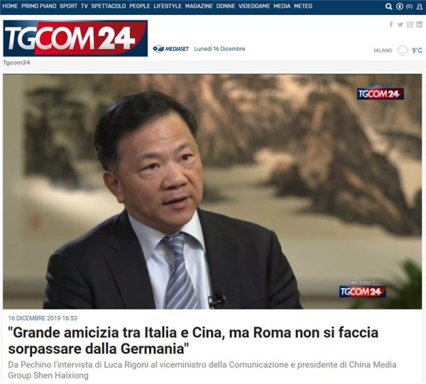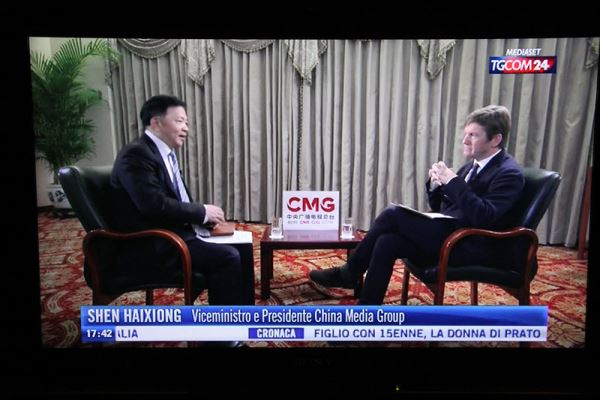 意大利最大的商业媒体集团TGCOM24电视台,近日专访中央广播电视总台台长慎海雄。慎海雄就媒体变革、中国经济、中美贸易以及香港问题等回答了意大利知名主持人卢卡•里戈尼的采访。意大利时间2019年12月16日,TGCOM24在多档黄金时段的节目里播出了这次专访。专访全文如下:
