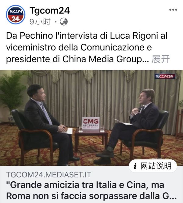 意大利TGCOM24新闻客户端播放慎海雄专访
