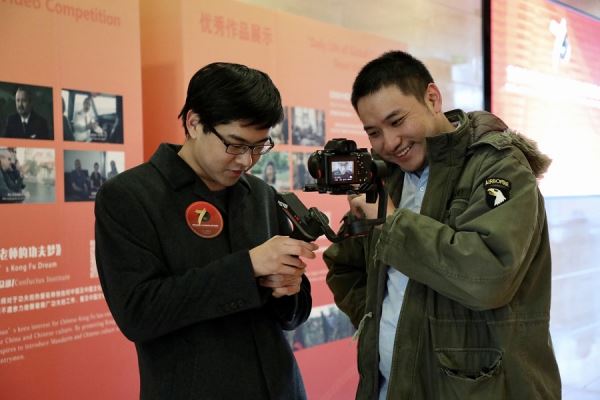 北京城市学院新闻专业学生宋明表示,观看获奖短视频不仅让他眼界大开,也让他学习到很多。(谢明/摄)