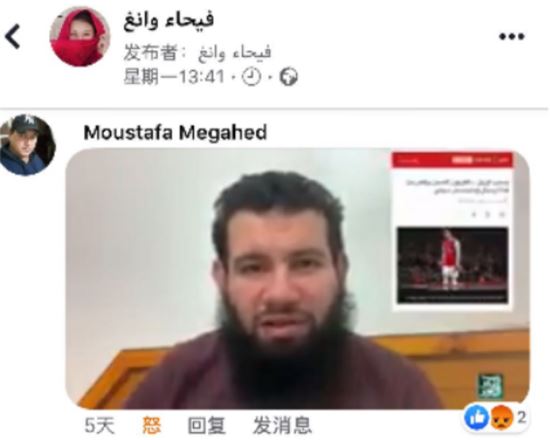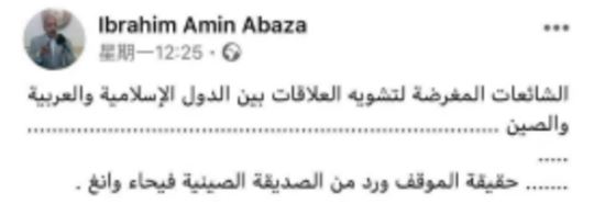 △埃及国家电视台著名记者Ibrahim Amin Abaza在自己的脸书账号上发帖:“这是破坏中国与阿拉伯国家、伊斯兰国家友好关系的谣言——请看我的中国朋友王馨对此问题的阐述。”