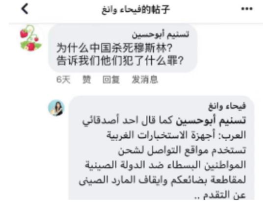 王馨用阿拉伯语回复:“正如我的一位阿拉伯友人所说,此次在多个社交媒体平台上掀起的抹黑中国新疆政策的浪潮,是西方势力早有预谋、精心策划的。(他们)企图通过对普通民众的洗脑,实现抵制中国商品,影响中国经济发展的目的。”