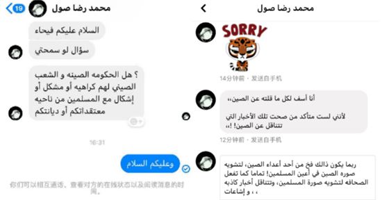 Mohamed Reda Sul:“对不起,我不该在没有确认消息真实性的情况下,就这么说中国。我也觉得有仇视中国的势力在故意抹黑中国在穆斯林心中的形象,就像他们会通过制造谣言来抹黑穆斯林的形象一样。我真的非常抱歉!”