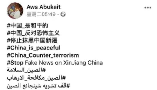 △约旦自由记者Aws Abukait用中阿双语在脸书上留言支持王馨。